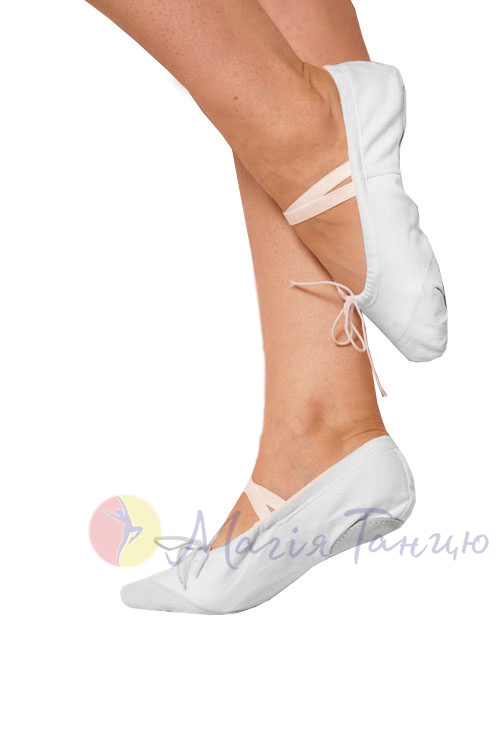 Бавовняні балетки для танців зі шкіряною вставкою на носку, також під п'ятою, і під носком - щільні шкіряні вставки, щоб не протиралися балетки. На балетках тонкі шнурочки-резинки, які необхідно підтягнути, щоб відрегулювати повноту ноги, тоді балетки не спадають.