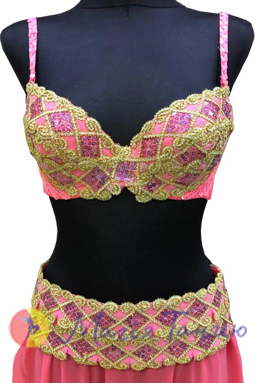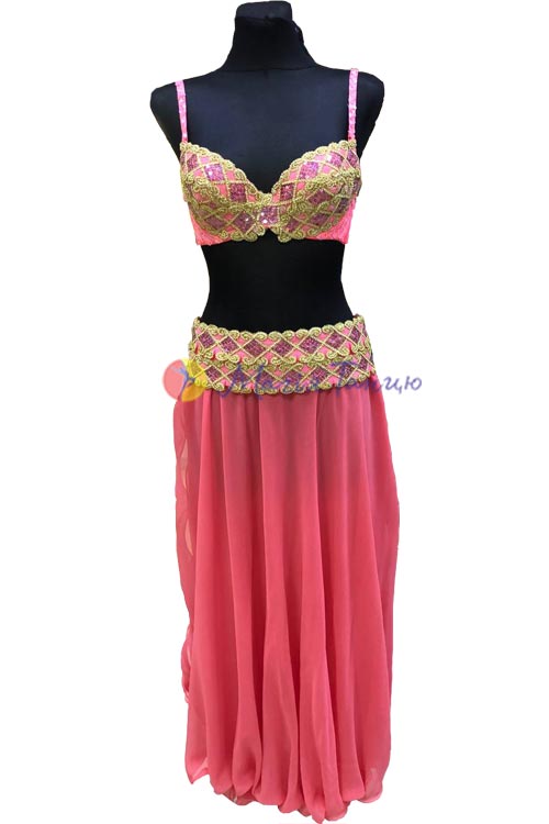 Розкіш золота і ніжність рожевого кольору поєднує в собі цей костюм для танцю живота, щоб ви відчули себе чарівною східною красунею. Ліф з паєтками підійде на розміри 34/75С, пояс розрахований на об'єми стегон 93-95 см. В Магії Танцю ви можете купити східні костюми схожих моделей також на інші розміри.