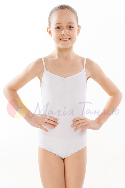 Абсолютно білий купальник на бретелях — це класичний образ для балетних та хореографічних занять. Завдяки універсальності моделі та комфортності матеріалу він може слугувати і як купальник для гімнастики. Достатня закритість та тонкі м'які бретелі забезпечують комфорт протягом всього тренування.