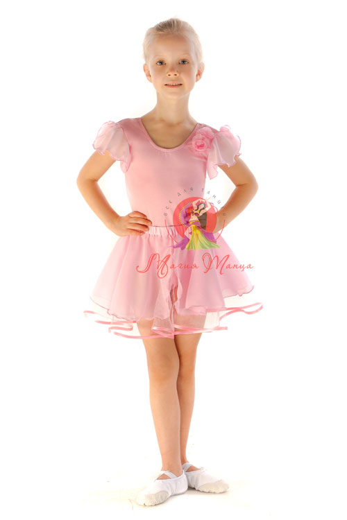 Гарний ніжно-рожевий набір для балету для дівчаток. У комплект входить балетний купальник зі спідницею. Купальник пошитий з бавовняної тканини, рукава-крильця з шифону, а особливість цієї моделі - красива акуратна трояндочка в верхній частині. Спідниця пошита з двох шарів: нижній - фатин, верхній - шифон. Ці тканини створюють миловидну форму та підкреслюють ніжний образ маленької дівчинки. В наявності розміри на зріст: 116 см, 122 см, 128 см.