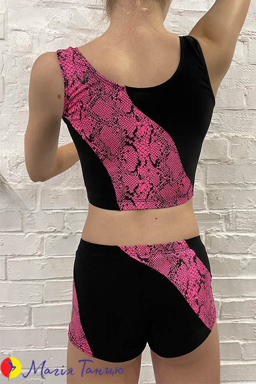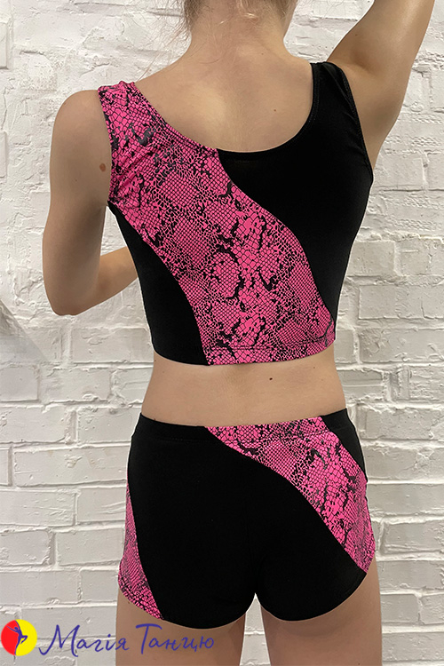 Чорно-рожевий комплект для пол денс, складається з шортиків і топа. Еластичний трикотаж масло м'якенький до тіла, чудово облягає фігуру, не зминається та не закочується під час танцю. Ці топ і шорти для пол денс легко комбінувати з іншими елементами тренувального одягу. Принт пітон на рожевому фоні ефектно поєднується з чорним кольором. Топ і шортики з резинкою.