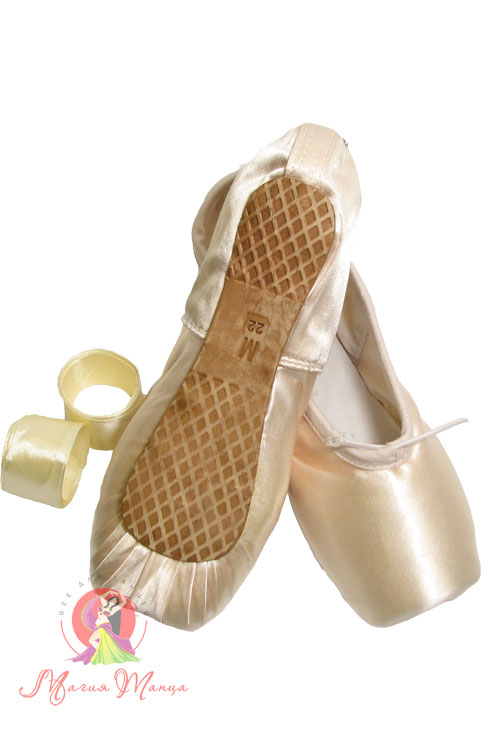 Дана пара пуант тілесного кольору з U-подібним вирізом. Матеріал верху - сатин, всередині - підкладка з бавовняного полотна. Устілка середньої (М) ступені жорсткості.