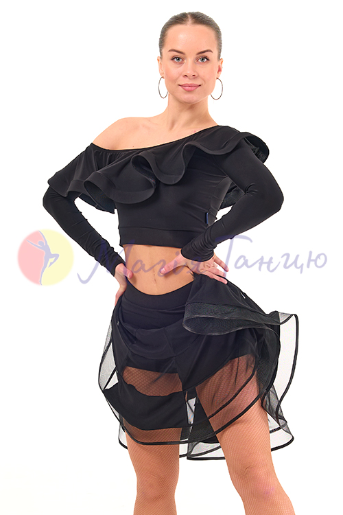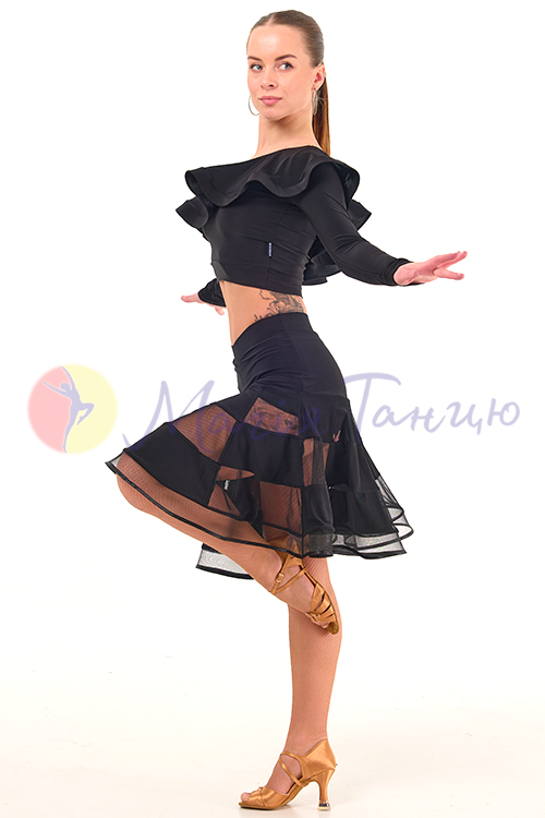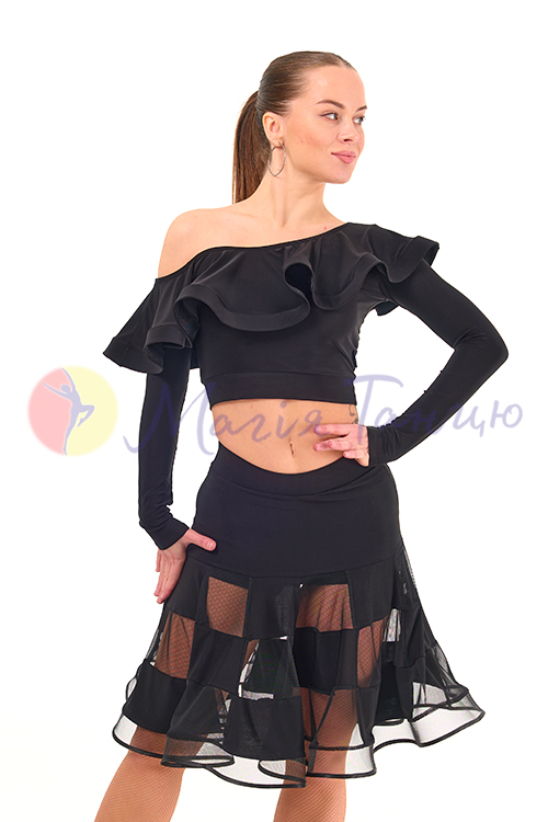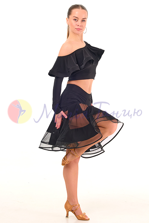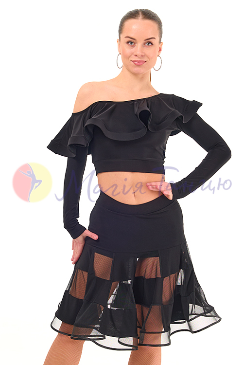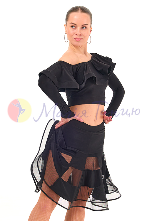 Обирайте спідниці для латиноамериканських танців у першу чергу за зручністю. Для дівчат, які носять одяг розміру XS, комфортною буде ця чорна спідниця з ушитими шортиками. Вона красиво облягає стегна чорним маслом та ефектно розходиться донизу широкими воланами із сіточкою. Спідниця для латини Парадайз створена, щоб ваш танець приносив вам максимальне задоволення.