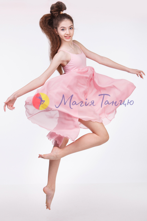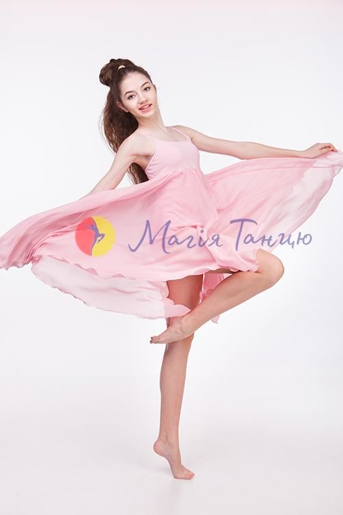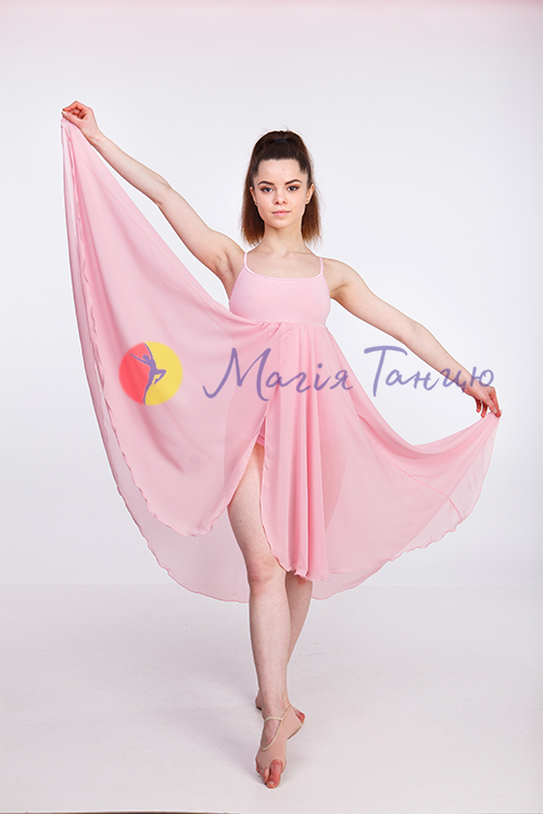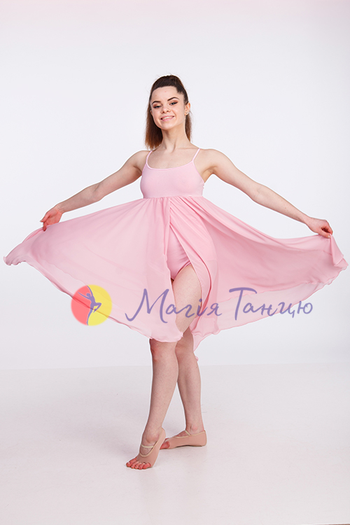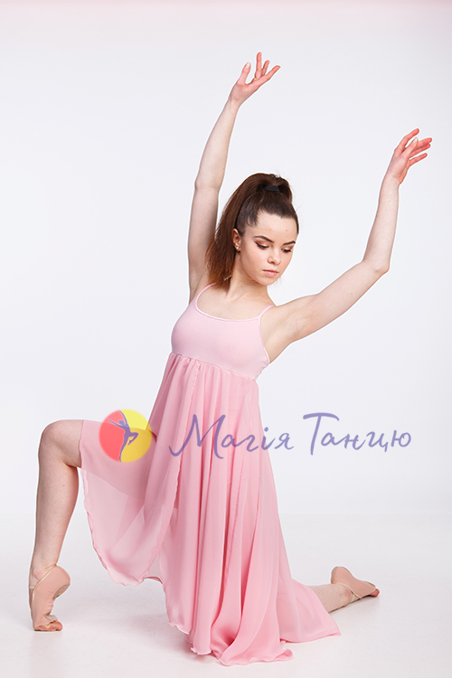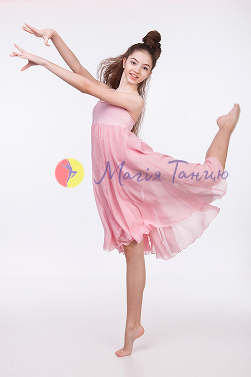 Рожева сукня хітон складається з трикотажного бавовняного купальника на бретелях та вшитої спідниці-сонця з шифону. Це чудовий одяг для сучасної хореографії: легкий, зручний, в міру відкритий.