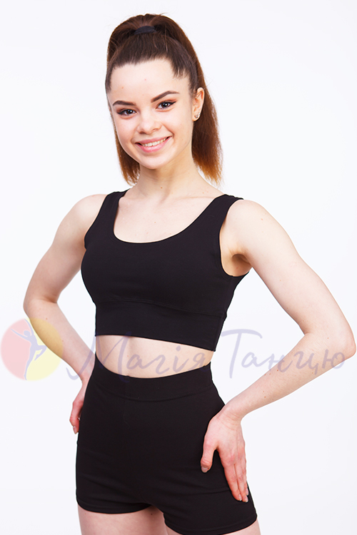 Топ тренувальний із бавовни. Топ без резинки внизу, тому не передавлює та не сковує рухів під час тренування. Підходить для занять фітнесом, пол-денс, спортом, танцями. Тканина - кулірка, 92% бавовна і 8% еластан.