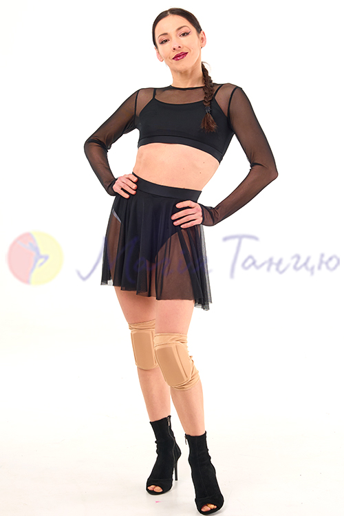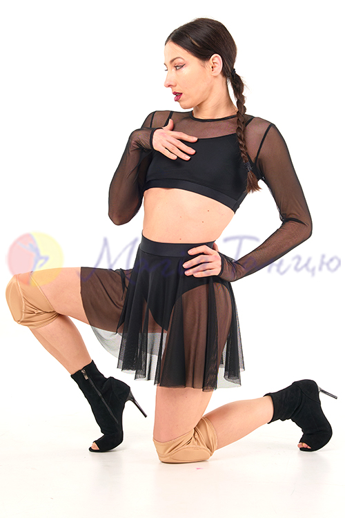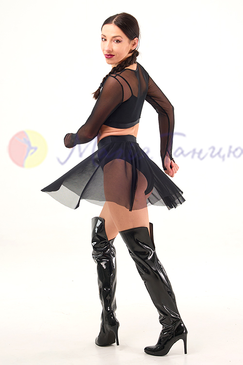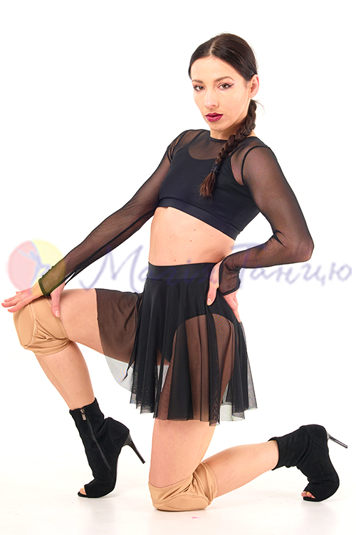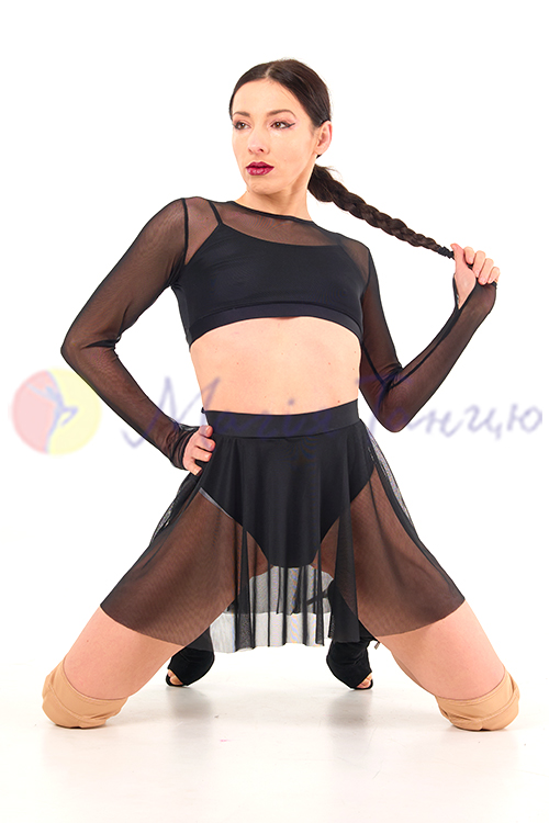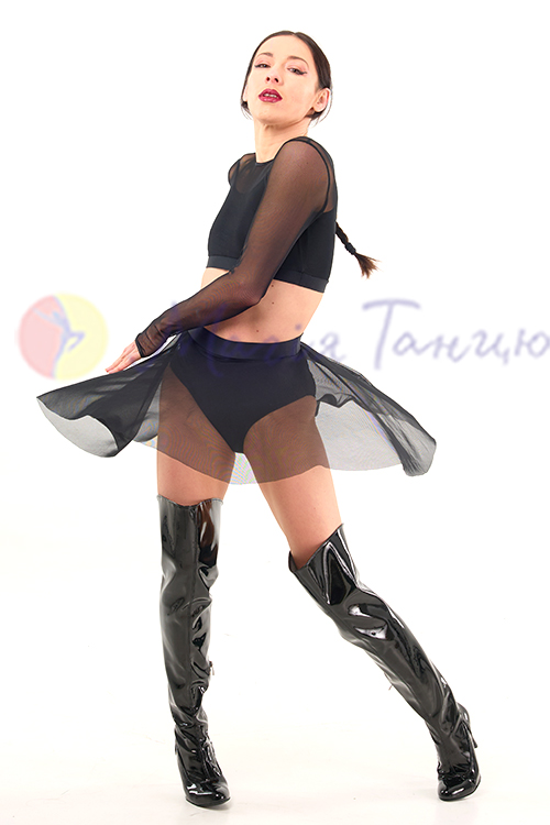 Для джаз фанку, стрипу, хай хілс це просто ідеальний костюм. В ньому легко рухатися, він достатньо відкритий для створення відвертих образів. А завдяки вшитим непрозорим топику та трусам глядачі не побачать забагато. Топ та спідниця з сіточки неперевершено виглядають зі взуттям на високих підборах.