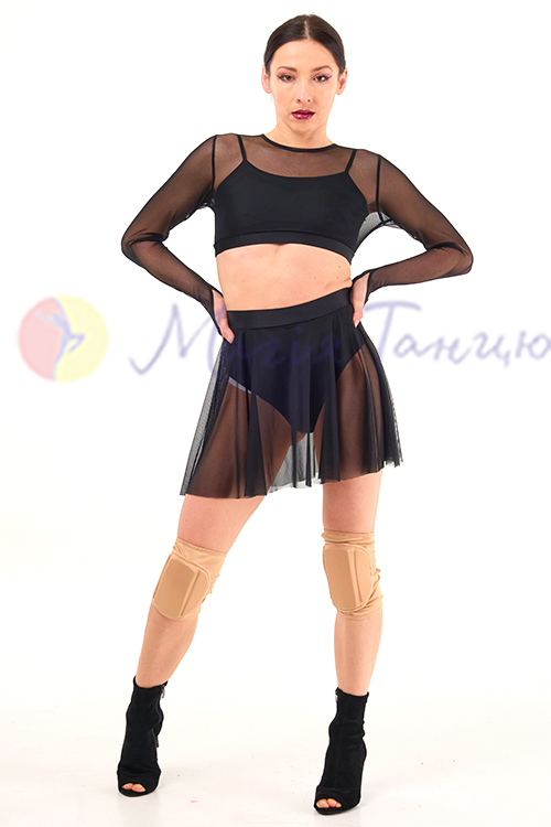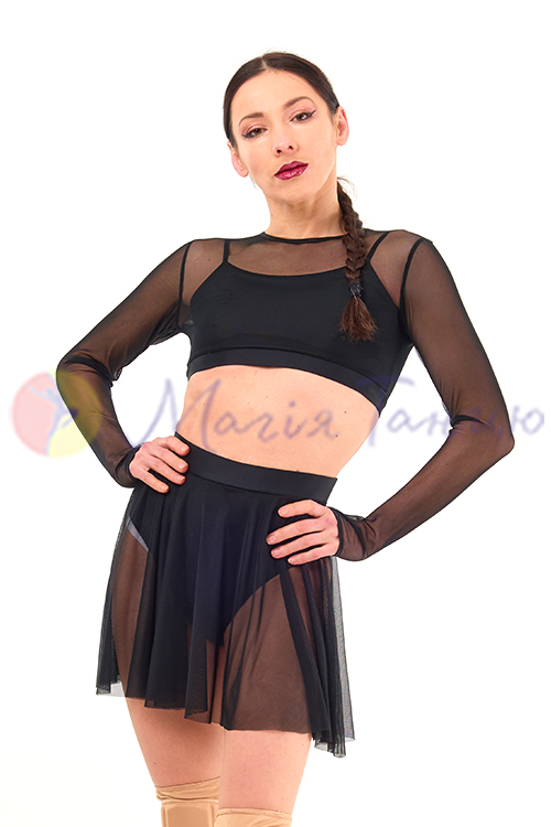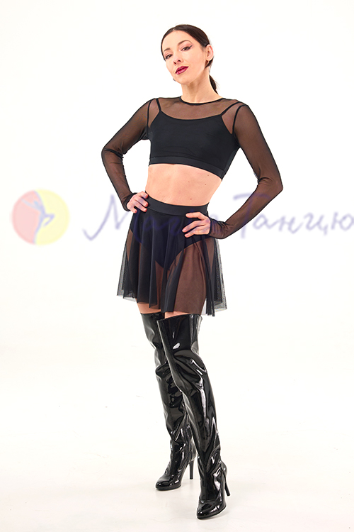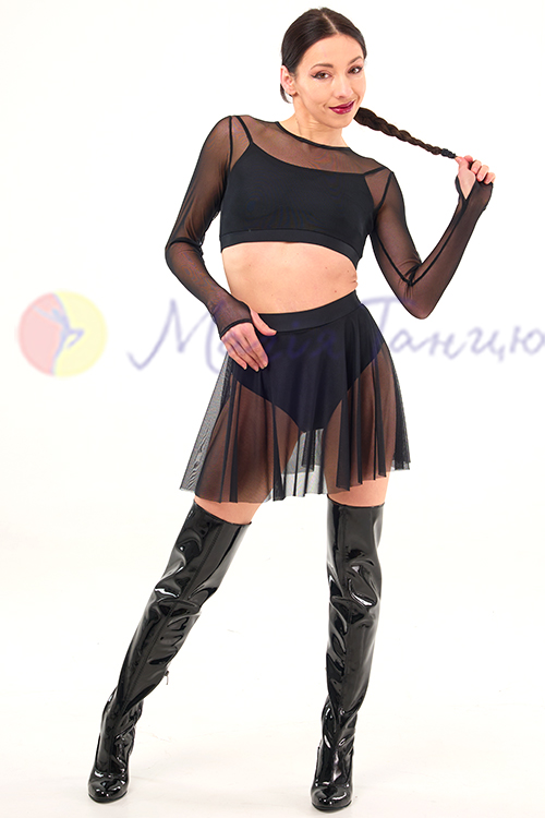Топ із сіточки з довгими рукавами, під низ вшитий короткий топик на бретелях з матового біфлексу. Комплектом до цього топа можна купити спідницю з сітки із трусиками.
