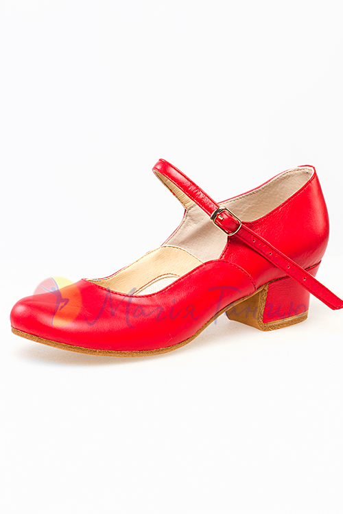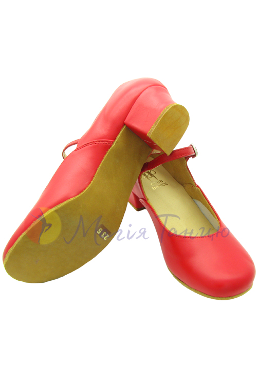 Туфлі для народних танців. Колір - червоний, матеріал - натуральна шкіра. Підбори міцні, висота підборів - 4 см. Використовуються в народних українських, циганських, фламенко та інших танцях. Всі розміри є в наявності. Виробництво - Україна!